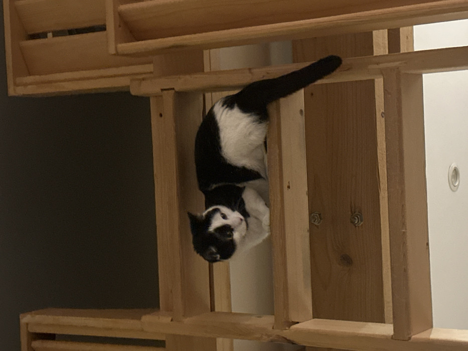 - "A black and white domestic cat is positioned in a crouching posture on a light-colored, unfinished wooden multi-tiered structure, consistent with a shelving unit or a cat tree, located in Puteaux, France" by FM-IHyJw1, licensed under CC BY 4.0