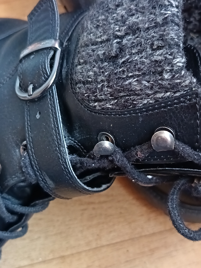 A close-up, high-angle shot depicts the upper portion of a single black boot, resting on a light brown wooden surface. The boot features a textured, possibly leather, main body with visible stitching. A prominent silver-colored metal buckle with a single prong is situated on a black strap on the lateral side of the boot. The ankle collar and tongue area are comprised of a grey, densely woven or knitted material, displaying a variegated grey and white flecked appearance. Black shoelaces are threaded through several silver-colored metal hooks and eyelets, with one loop of lace visible towards the lower right. The wooden surface below exhibits a grain pattern consistent with floorboards. The depicted scene is located in Kamenz - Kamjenc, Germany.