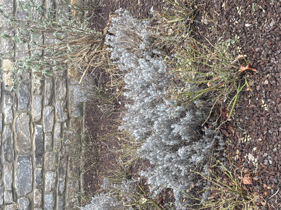 The image displays a garden bed positioned in front of a stone wall in Echzell, Germany. The background features a robust wall constructed from varied grey and brown stones, laid with visible mortar lines. The ground of the garden bed is covered with a dark reddish-brown mulch composed of small, angular particles. In the foreground and mid-ground, multiple plants are present. A dense, low-lying shrub with silvery-grey, narrow leaves, consistent with lavender, occupies the central area. To the right of this plant, a taller, multi-stemmed woody shrub, largely defoliated with only sparse greenish-grey leaves, stands upright. Scattered throughout the bed, particularly around the lavender and closer to the wall, are several smaller, thorny, woody plants, appearing to be dormant or recently pruned rose bushes, with minimal green foliage. The scene is illuminated by diffused, natural light, suggesting an overcast day or indirect sunlight, indicative of late autumn, winter, or early spring conditions. No individuals or active subjects are visible within the frame.