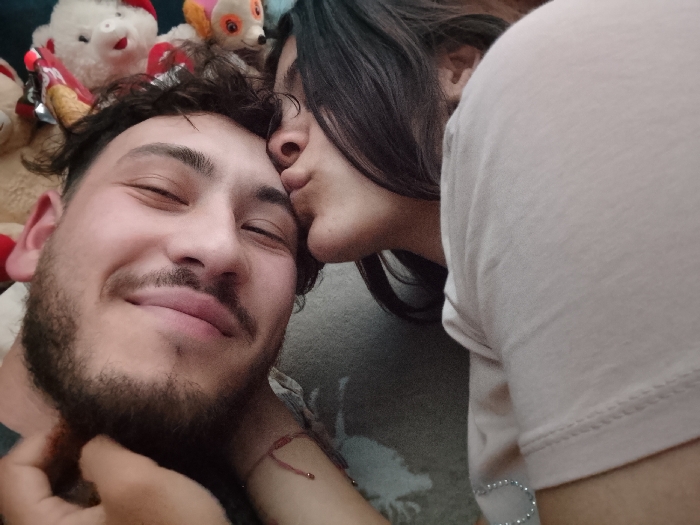 This indoor image is set within a private residence in Roman, Bulgaria. It features a close-up view of two individuals. On the left, a male subject with dark, curly hair, a beard, and a mustache smiles with closed eyes, his head tilted slightly back, wearing a dark garment. On the right, a female subject with long dark hair, dressed in a light-colored, possibly pale pink, t-shirt, leans in to kiss the male subject's forehead near his temple. Her left hand is visible near the male's neck/jawline, displaying a thin red string bracelet with a small bead on her wrist. The background, partially obscured, contains several stuffed animals, including a white one with a red accessory and a yellowish-orange one, suggesting a casual, personal environment.