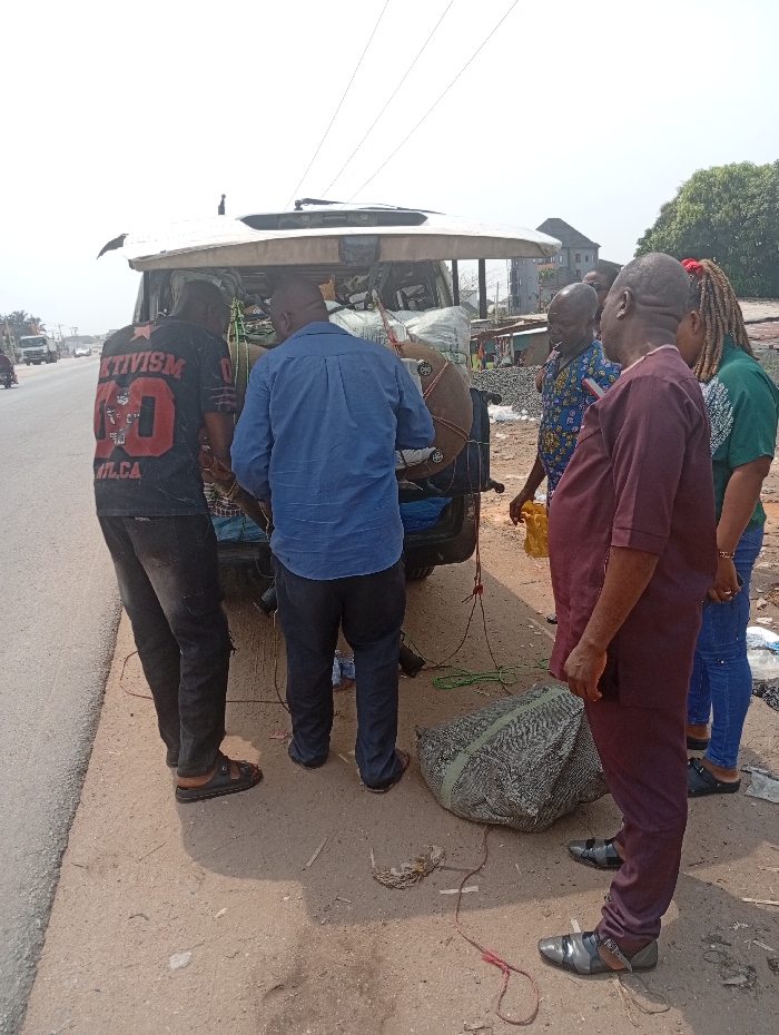 The scene depicts an outdoor gathering in Obinze, Nigeria, on an unpaved roadside next to a paved two-lane road under bright daylight. Six individuals, five men and one woman, are clustered around the open rear hatch of a light-colored utility vehicle or van. The vehicle's rear compartment is filled with various items, including sacks and bundles. A dark, round object, possibly a spare tire, is secured to the exterior rear with ropes. On the ground to the right of the vehicle lies a large, grey-patterned duffel bag or sack. Scattered ropes, some red and some green, are visible on the dusty, reddish-brown ground. From left to right: 1. A male subject, viewed from the back, wears a black t-shirt with red lettering "AKTIVISM 10 WILCA," dark jeans, and black sandals. He leans into the vehicle's rear. 2. A male subject, viewed from the back, wears a blue long-sleeved shirt and dark trousers. He stands directly behind the vehicle, also interacting with its contents. 3. A male subject, partially obscured, wears a blue and yellow patterned shirt. He observes the activity. 4. A male subject, in the foreground, wears a maroon long-sleeved tunic and matching trousers with black and grey formal shoes. He stands with his right hand in his pocket, looking towards the vehicle. 5. A female subject, viewed partially from the back, wears a green shirt and blue jeans, with reddish-brown dreadlocks or braids. She also observes the vehicle. 6. Another male subject, partially obscured by the individual in the blue shirt, is also present. In the background, a paved road with distant vehicles is visible to the left. To the right, construction materials or debris are present, along with a multi-story building and trees in the far distance. Overhead power lines traverse the sky.