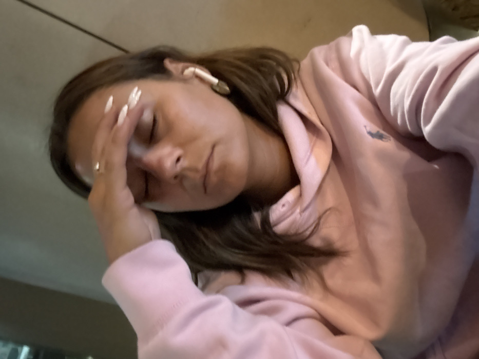A woman rests her head in her hand, appearing tired or unwell. She wears a light pink hooded sweatshirt with a polo player logo. Her nails are long and painted white. She has brown hair and an AirPod in her ear. The image is taken from a low angle, focusing on her face and upper body. The background is blurred and indistinct.