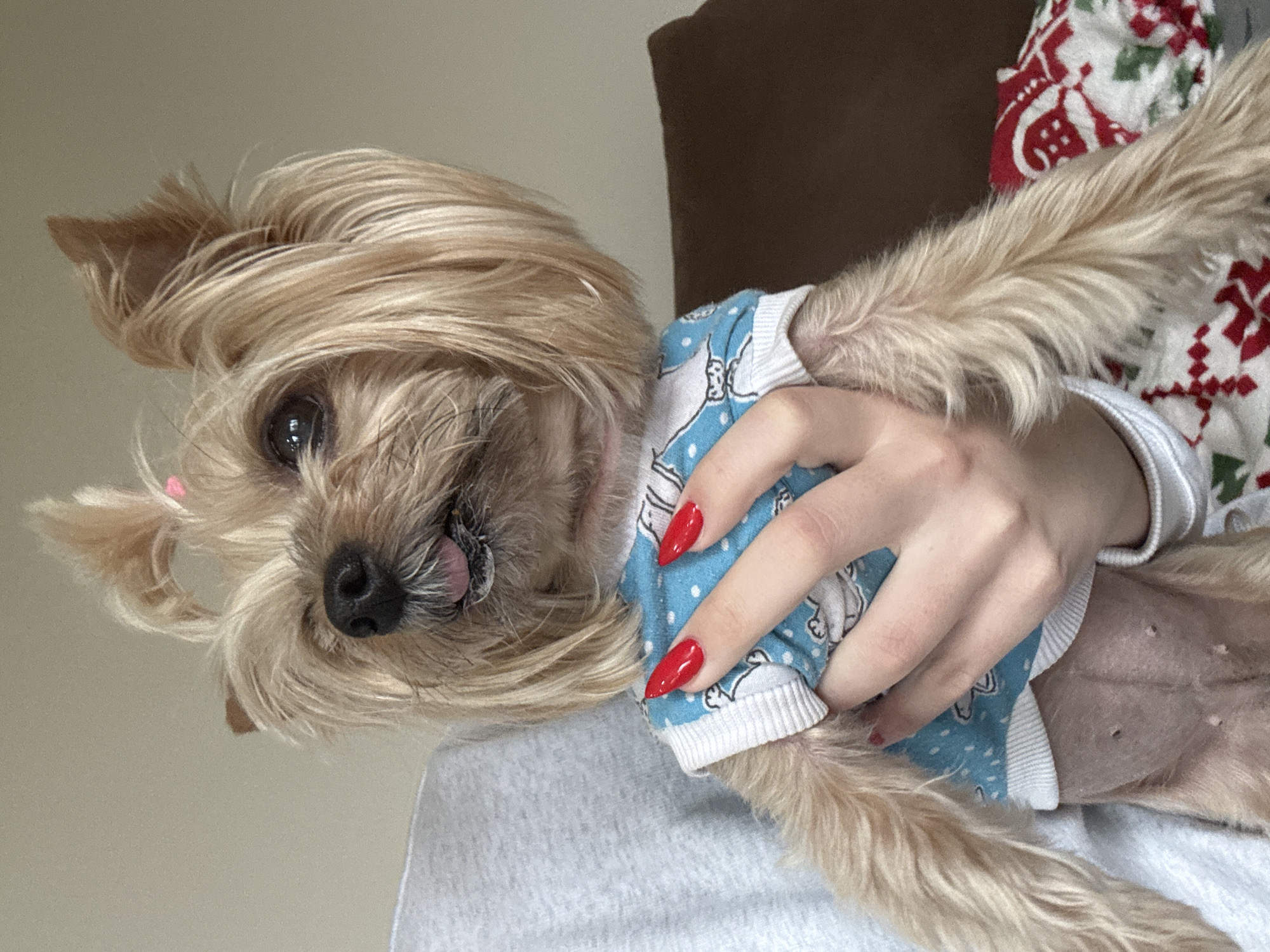 A medium shot shows a light brown Yorkshire terrier dog being held in a person's arms