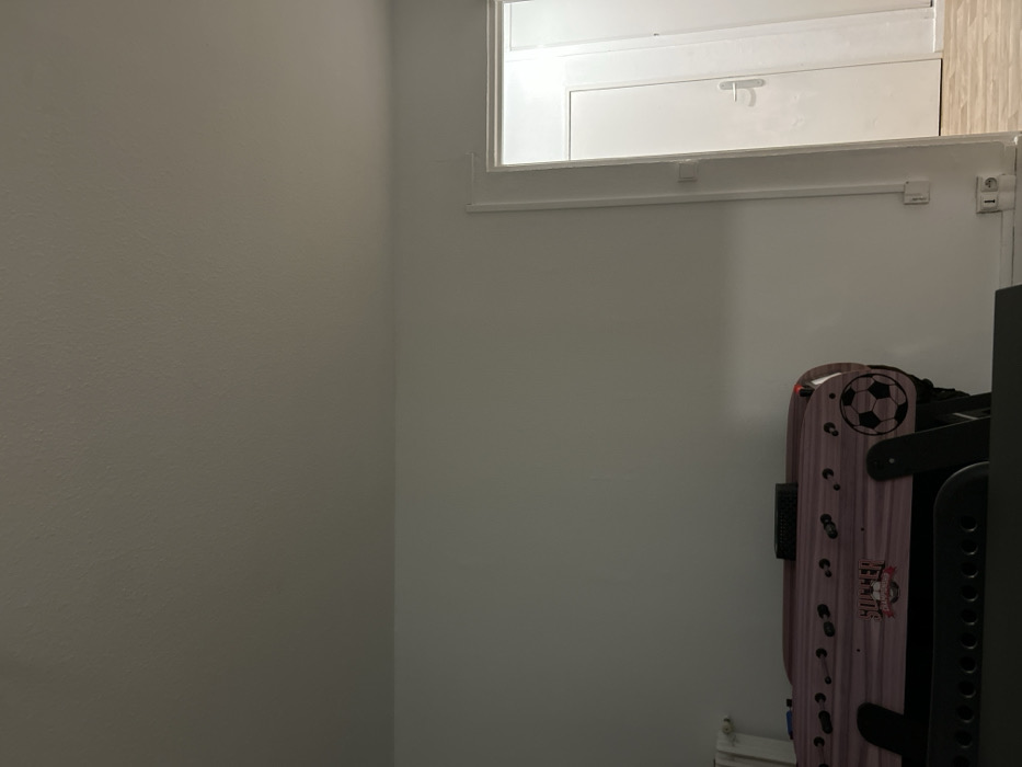 A room corner with light gray walls and a window near the ceiling. A pull-down ladder is partially visible through the window. A small, decorated foosball table, featuring a soccer ball design, is leaning against the wall. A dark, metal workout rack stands next to the table, partially obscuring the view. The room appears to be in a basement or storage area, based on the lighting and items present.