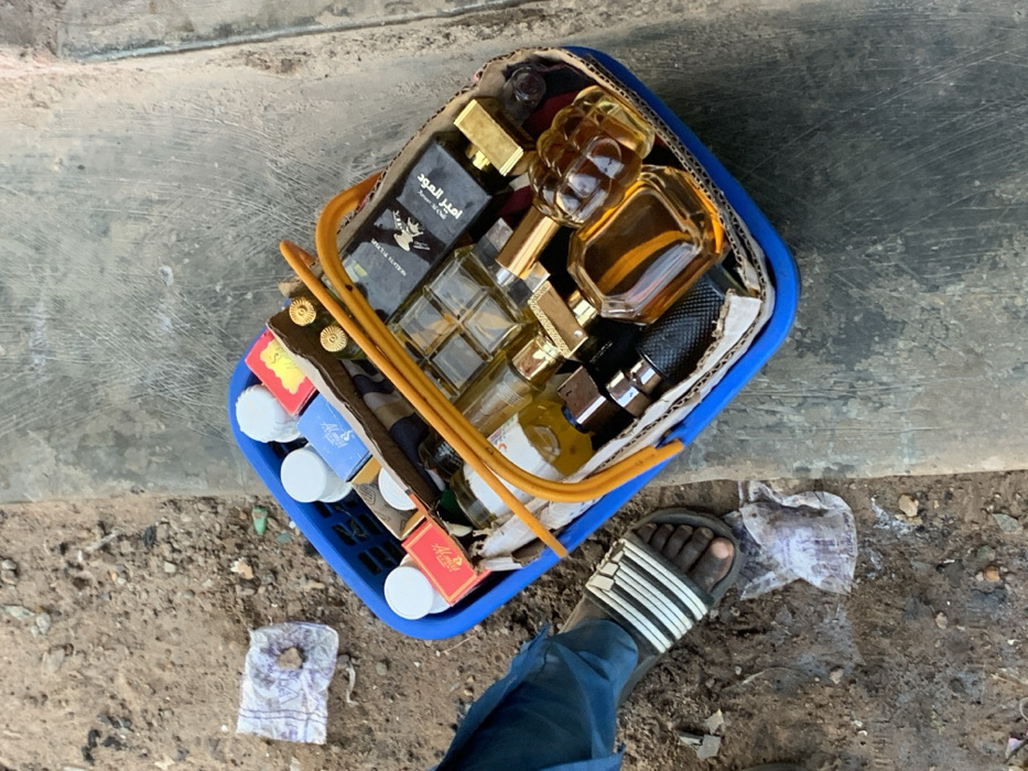 The image presents an overhead view of a blue plastic basket filled with various small bottles and boxes, primarily perfumes and fragrances, situated on the ground in Minna, Nigeria