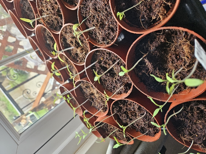 - "A collection of approximately 30 small, green plant seedlings is arranged in individual terracotta-colored plastic pots, positioned indoors on a flat surface next to a window" by FM-IXyqk2, licensed under CC BY 4.0