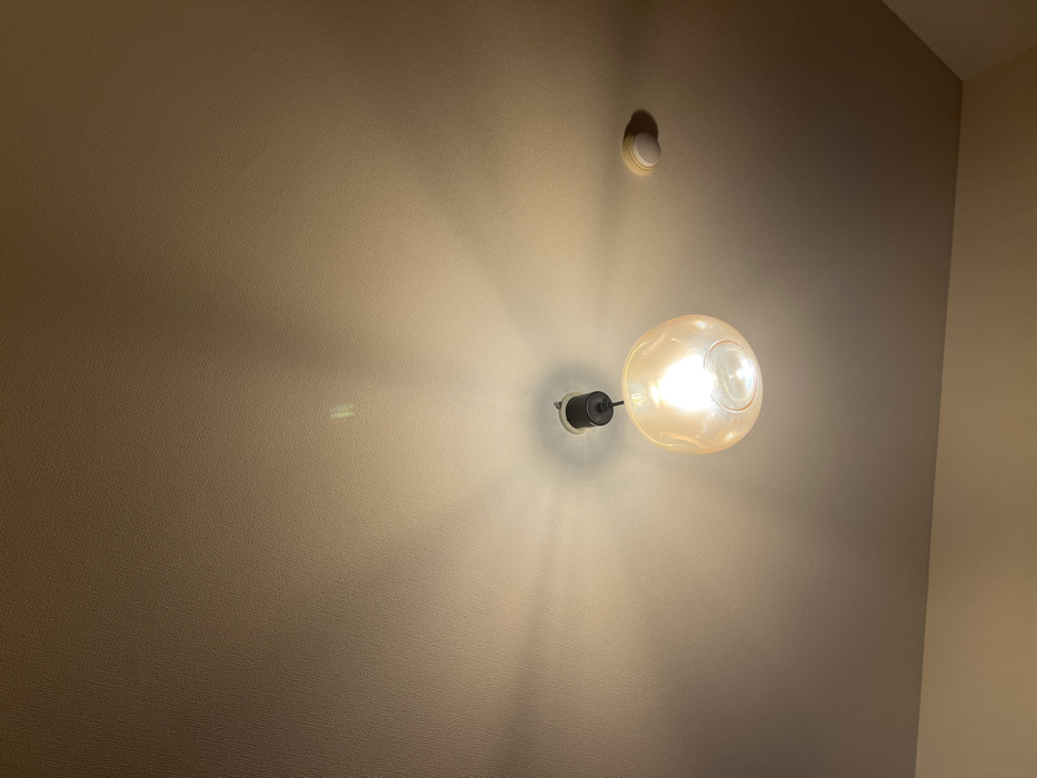 An upward-angled view depicts an indoor ceiling in Ichikawa, Japan. The ceiling surface is textured and light beige. A spherical glass light fixture, producing warm yellow-orange illumination, is suspended from a black ceiling mount with a white collar, positioned slightly left of the image center. To the right of the light fixture, a circular, off-white smoke detector or similar sensor is affixed to the ceiling. A faint, irregular greenish mark is visible on the ceiling above and to the left of the light fixture. No individuals or specific actions are visible; the scene primarily focuses on the fixtures and ceiling architecture.