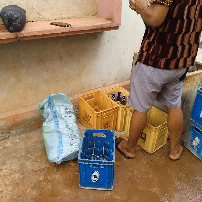 A man stands amongst stacks of beverage crates. The crates, mostly yellow and blue, are scattered around on a wet ground, with a few bottles visible within one. A bag sits near the crates. The man wears patterned brown top and gray shorts, with brown sandals. In the background, a wall has a shelf with a black plastic bag and a phone on it.