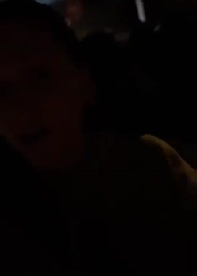 A person is in a car at night. The interior is dark. The person is looking at the camera. Music is playing.