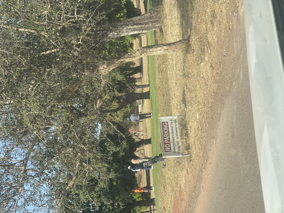 The image depicts an outdoor daytime scene at a golf course in Jos, Nigeria. A dirt path occupies the immediate foreground, with a white surface, possibly a vehicle's dashboard, visible at the bottom edge. A prominent rectangular white sign with red lettering stands upright on the left side of the path, reading: "NO PARKING Damage/injury caused by a flying ball is at owner's risk." Beyond the path, the ground transitions from dry, sparse grass to a manicured green golf course. Five adult males are distributed across this green area, engaged in or observing a golf game. On the far left, one individual in an orange shirt, white pants, and white shoes stands. Centrally, two individuals are grouped together; one wears a white shirt and dark pants, the other a light brown shirt and dark pants. A black golf bag on a trolley rests on the ground near them. To the right of this group, another individual in a dark blue shirt and dark pants stands near a red flag marking a golf hole, holding a golf club. A fifth individual, also in dark clothing, is visible further back and to the right on the green. The background is dominated by numerous mature trees with varying foliage density, providing partial shade over the course. The sky above is clear and blue, indicating bright daylight conditions.