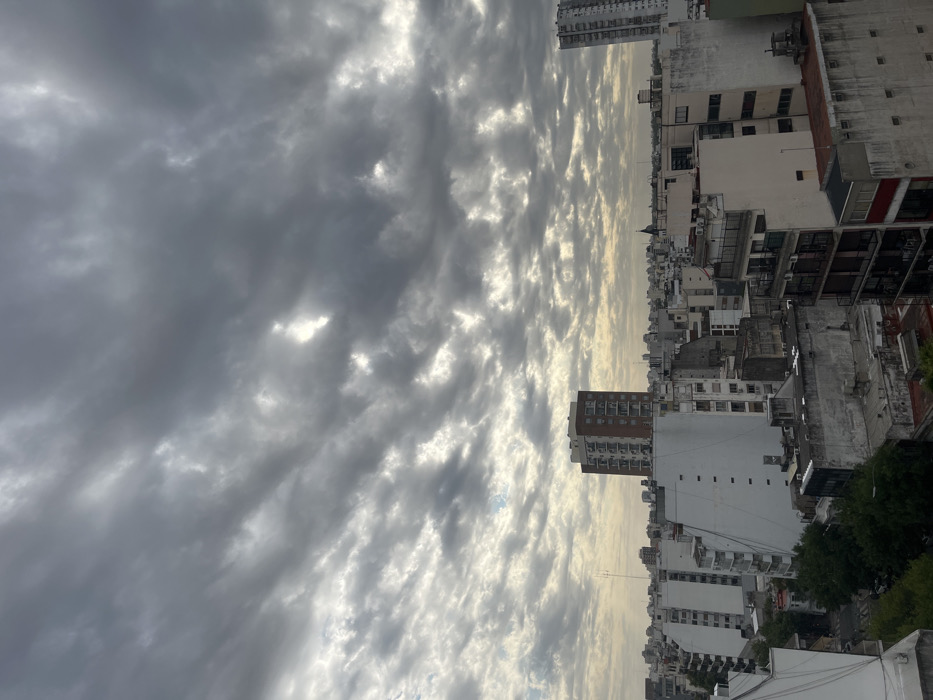 A cityscape under a heavily clouded sky. The clouds are predominantly gray with interspersed patches of light. Numerous buildings of varying heights and architectural styles fill the urban space. Buildings appear densely packed, with visible variations in colors and textures of their facades. Greenery peeks through some areas, suggesting possible parks or gardens.