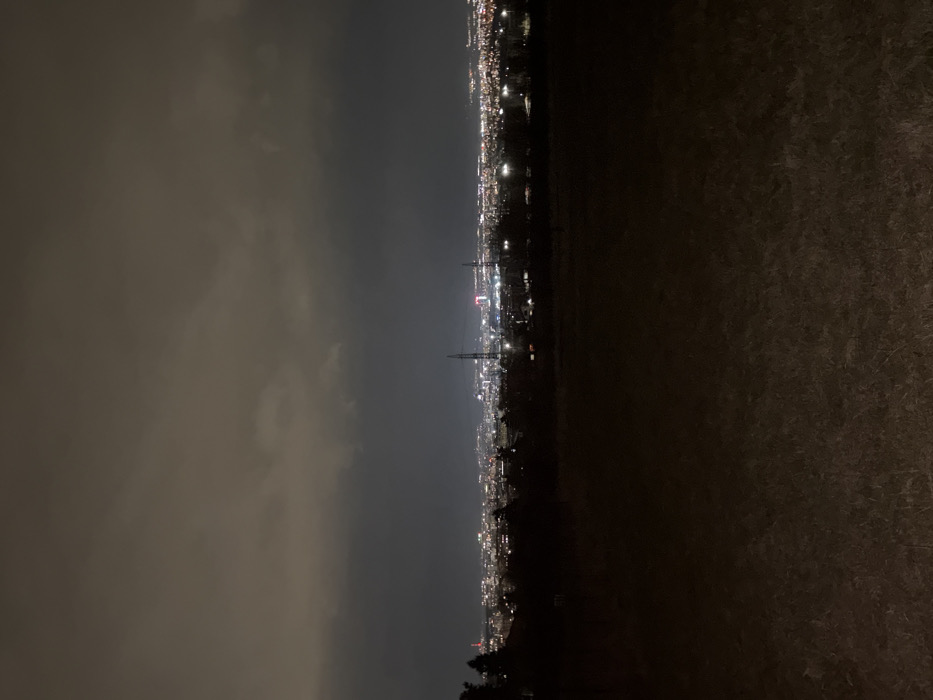 The image depicts a nighttime panoramic view of the city of Sofia, Bulgaria, observed from an elevated, unilluminated vantage point, likely on the northern slopes of Vitosha Mountain, looking over the urban area. The scene is dominated by a dark, heavily overcast sky, occupying the top half of the frame. The clouds reflect a faint, diffuse yellowish-brown ambient light originating from the city below. The foreground, comprising approximately the bottom third of the image, is an unlit expanse of dark brown ground, appearing as a field or sparse vegetation, with minimal discernible detail. Mid-ground elements include a dark, irregular horizontal line of silhouetted trees or dense bushes, separating the immediate foreground from the city. Two prominent, dark industrial-style electricity transmission pylons are visible against the city lights; one slightly left of center, the other further right. The background presents a sprawling urban landscape illuminated by numerous artificial lights. The city lights appear as a dense, horizontal band of white, yellow, and occasional red pinpoints, indicating buildings, streets, and commercial zones. A distinct, large red-lit structure, consistent with the appearance of the Bulgaria Mall, is visible slightly right of center within the illuminated cityscape. To the far left, a smaller, vertically oriented red-lit structure, possibly a telecommunications tower or antenna, is also discernible. No individuals, specific actions, or interactions are visible within the frame.