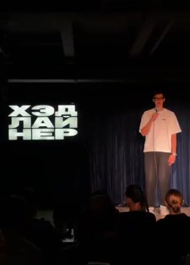 A male stand-up comedian is on stage in front of a seated audience. He stands center stage, holding a microphone, wearing eyeglasses, a white t-shirt, grey pants, and white shoes. Behind him is a dark blue curtain and a large sign in a foreign language with white letters, backlit. The lighting is dim. The audience is mostly silhouetted. One person in the audience is holding up a cell phone to record the performance.