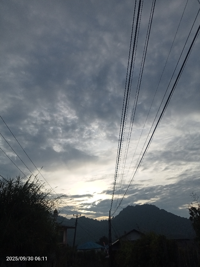 The image, captured on 2025/09/30 at 06:11, presents a dawn scene in a mountainous settlement within the city of Unknown, Unknown. The sky is largely overcast with stratocumulus clouds, displaying a bright area of low sunlight toward the lower center, indicative of sunrise. Numerous dark utility lines span the upper two-thirds of the frame diagonally, suspended from indistinct poles in the midground. The foreground on the left contains dense, dark green foliage. In the midground, silhouetted structures include a prominent mosque minaret with a dome and spire on the left, alongside other dark building outlines, one featuring a light blue roof. A large, dark forested mountain or hill occupies the background on the right. No human figures or animals are present.