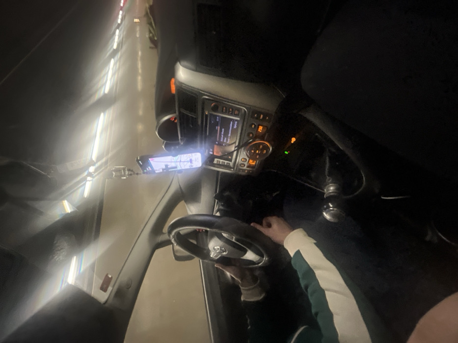 The image depicts the interior of a passenger vehicle from the front passenger's perspective, operating within a brightly illuminated tunnel near Airolo, Switzerland. A driver, wearing a dark garment with white and green arm detailing, has both hands on the black steering wheel, which bears a Toyota emblem. A smartphone, displaying a map application, is mounted centrally on the dashboard and connected by a cable to the car's infotainment system. This system, featuring a silver fascia, shows a digital display with text like "Playback" and "Recommendation," alongside illuminated controls indicating "23.0." A manual gear shift lever is visible in the center console. Partially visible in the lower right foreground is a dark-clad leg belonging to a passenger. The tunnel environment is characterized by continuous linear lighting fixtures along its ceiling and walls, creating bright reflections within the vehicle's interior.