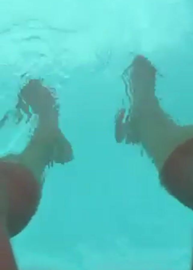 person's legs and feet submerged in clear, light blue water. The feet are pale and appear relaxed, moving slightly. The bottom of a dark-colored, possibly wooden, ledge is visible at the bottom of the frame. The water's surface is rippled, indicating movement. The overall environment suggests a pool or similar body of water.