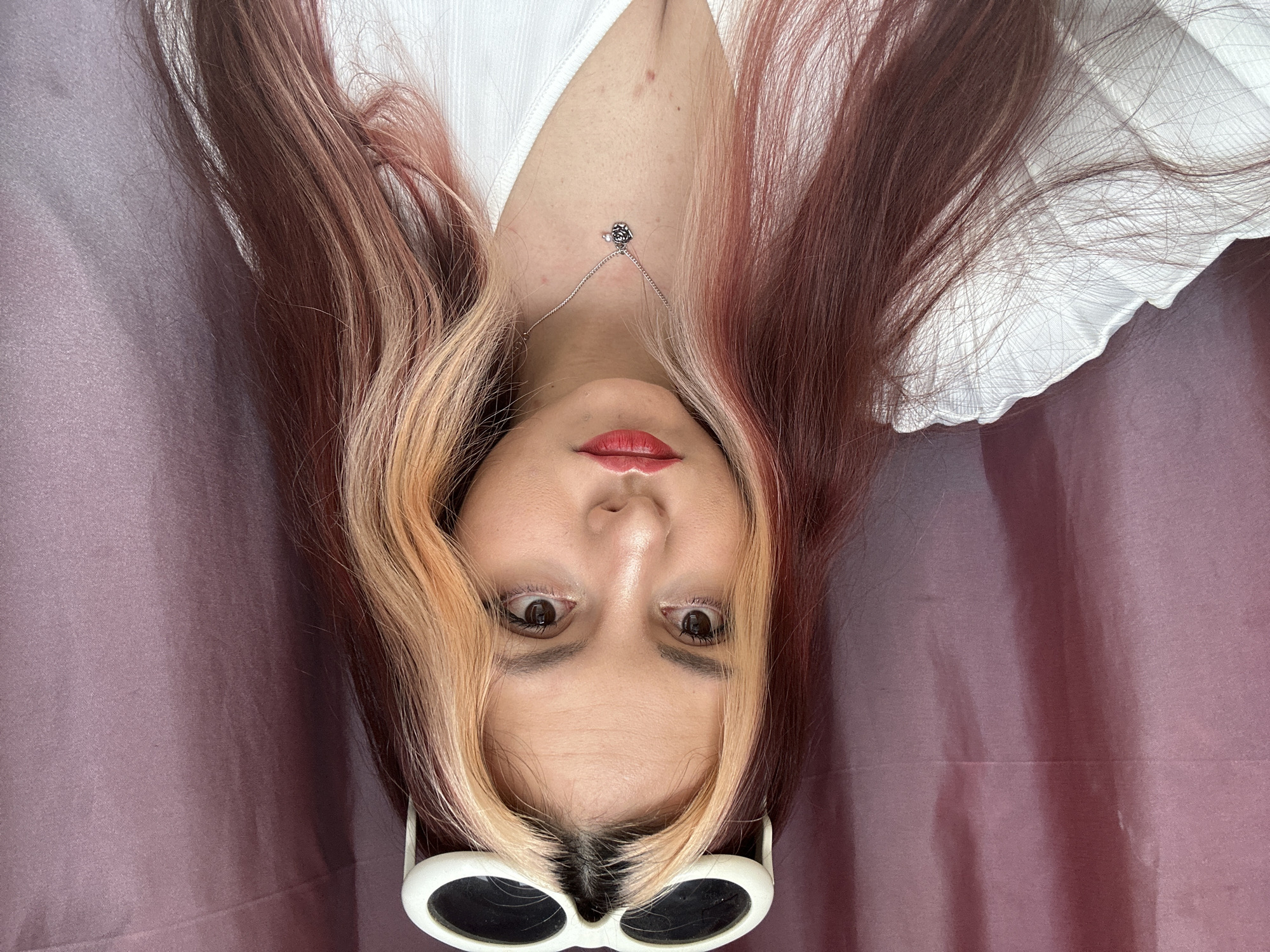 - "An indoor portrait captures a young adult female from the chest up, positioned against a plain, vertically draped, dark pink or light purple fabric curtain background" by FM-DkVH62, licensed under CC BY 4.0