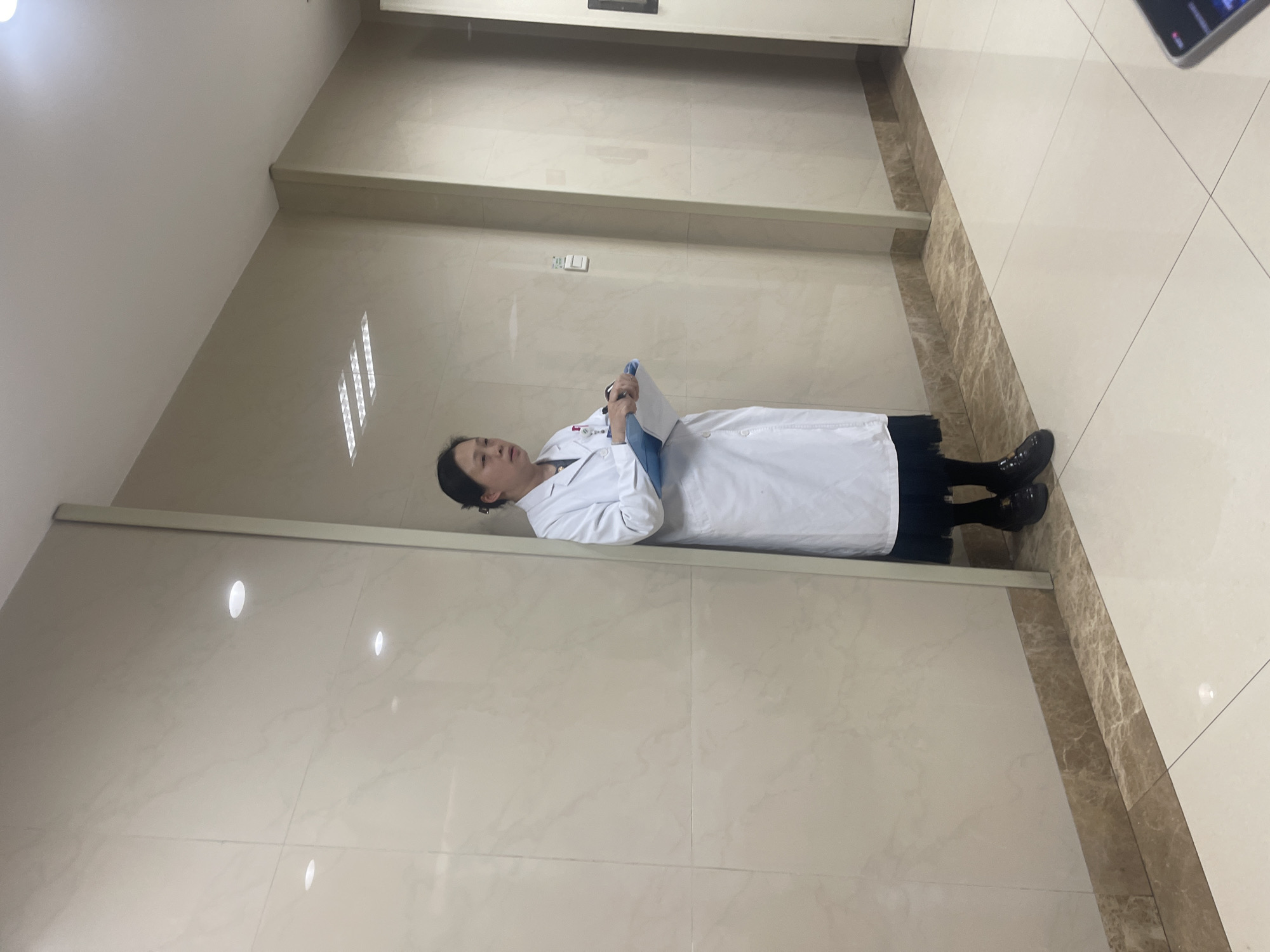 An adult East Asian female, dressed in a white lab coat over a dark skirt, dark tights, and black shoes, stands against a light beige, marble-patterned tiled wall in an indoor hallway within a medical facility in Yuzhong District, China
