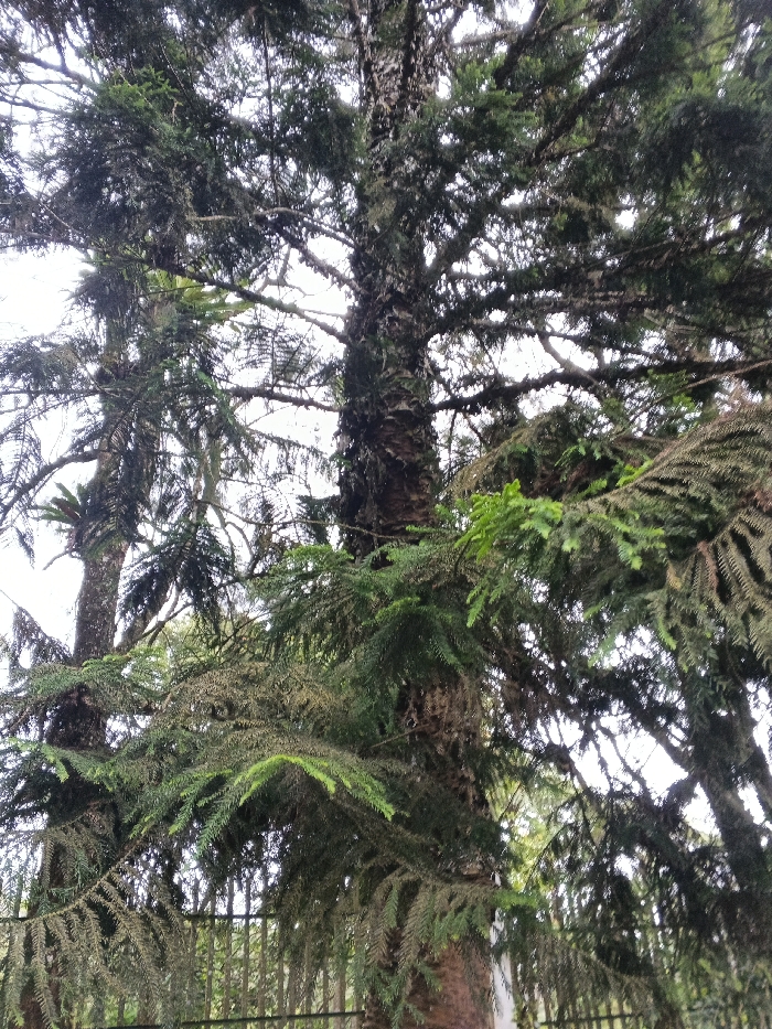 The scene depicts an outdoor environment in Munyati, Zimbabwe, dominated by a dense canopy of trees under an overcast or bright white sky. A large evergreen tree, likely a conifer, occupies the central and right portions of the frame, featuring a thick, dark brown trunk with textured bark and numerous branches densely covered in dark green, needle-like foliage. Lighter green new growth is observable on some branches. Partial views of other tree trunks and branches are visible to the left and rear, with at least one branch exhibiting an epiphyte characterized by broader leaves. A dark metal fence is present horizontally across the lower third of the image, partially obscured by the lowest tree branches. No human subjects or specific activities are visible.