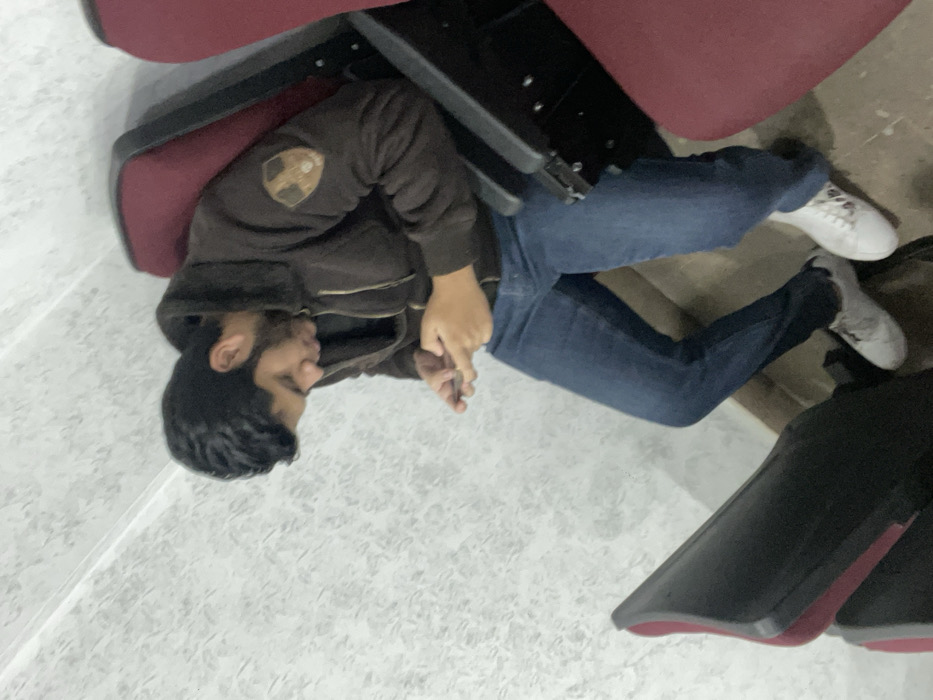 A person with dark hair sits between rows of theater seating, appearing engrossed in their phone. Dressed in a brown hooded sweatshirt and blue jeans, they wear white sneakers. The setting is a theater with red upholstered seats and a speckled floor. The individual is situated under the flipped-up seat of one row while potentially seated in the row behind them.