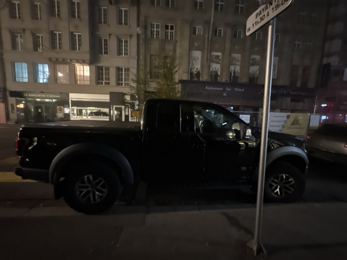 The image depicts a nighttime street scene on Place de l'Homme de Fer in Strasbourg, France. A large, black Ford F-150 Raptor pickup truck is parked parallel to the curb, facing right, dominating the midground. The truck's driver's side is visible, featuring a tonneau cover over the bed and distinctive off-road wheels. In the foreground, a metallic street pole with a white rectangular sign displaying "PAYANT DE 11H30 A 19H00" (Paid from 11:30 AM to 7:00 PM) stands upright. The background features multi-story stone buildings with numerous windows, some illuminated, and shutters. Visible shopfronts include "LA MAISON DE L'HOMME" on the left and "Restaurant Bar Bilsland" in the center, beneath a building wall adorned with multiple murals depicting groups of human figures. A portion of a lighter-colored car is visible behind the pickup truck on the far right. The scene is illuminated by ambient city lights and interior building lights, with no people actively visible in the frame.