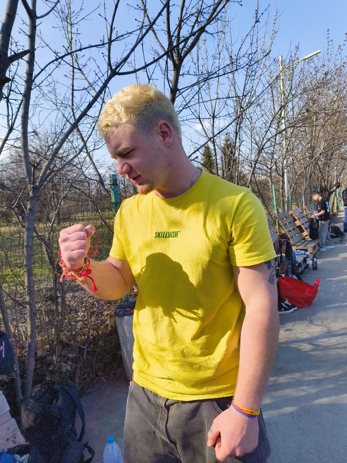 A male individual with short, bleached blond hair and a silver neck chain is depicted outdoors in an open area, likely a park, under clear blue skies. He wears a bright yellow short-sleeved t-shirt with "SKILLZDASH" printed in green on the chest and dark grey jeans. His right arm is bent, and his hand is clenched into a fist, displaying multiple red and yellow string bracelets wrapped around his wrist and forearm. His left hand is also clenched into a fist, wearing a yellow and blue striped wristband. Tattoos are visible on his left bicep. He is positioned facing partially right, looking downwards towards his left. The immediate environment features bare deciduous trees with thin branches and a green wire fence behind the main subject. A paved path runs to the right, where several wooden pallets are arranged, possibly as makeshift benches. Another individual in a dark shirt is visible standing near these pallets further down the path. A street light or utility pole is also visible in the distance. On the ground near the main subject's feet, a black backpack and a light blue plastic water bottle are present. This scene is located in Borisova Gradina (Boris's Garden) in Sofia, Bulgaria, consistent with its recreational areas and skate park vicinity during late winter or early spring conditions.