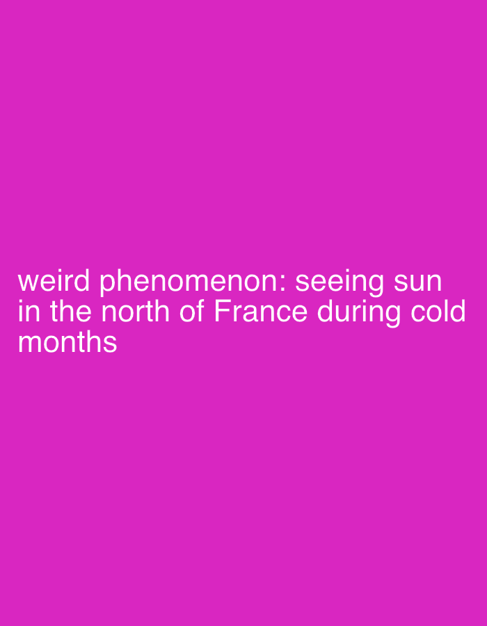 The image displays white text superimposed on a solid magenta background. The text, centered at the lower portion of the frame, reads: "weird phenomenon: seeing sun in the north of France during cold months". No discernible people, objects, actions, or specific environmental features, including those of Roubaix, France, are visually present within this image. The scene is entirely graphic, consisting of typography on a monochromatic field.