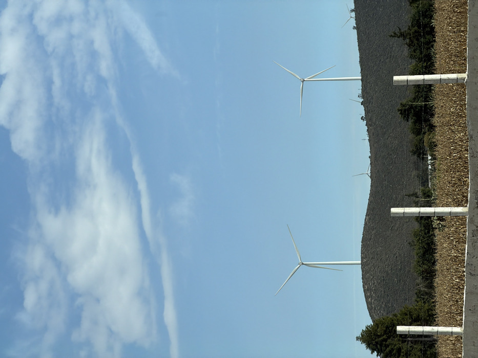 A sunny, daytime landscape shows a blue sky with wispy white clouds. In the distance, wind turbines stand atop a grassy hill, positioned behind a wire fence and concrete posts. Some trees are present on the slope. The image has been rotated, causing the sky to appear on the left and the ground on the right.