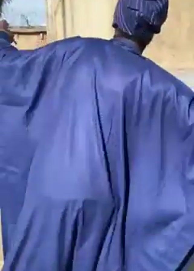 A man dressed in a flowing, dark blue robe and matching headwrap is standing outside next to a beige wall