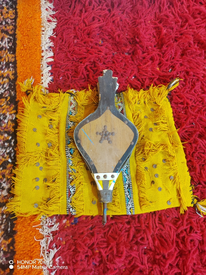 A vintage bellows rests on a vibrant textile arrangement. The bellows, crafted from wood, features a star-shaped pattern on its front. It's flanked by a bright yellow fabric with fringed edges and decorative circular accents. This yellow piece sits atop an orange and red rug with varying textures, adding depth and richness to the composition. The overall aesthetic blends rustic charm with colorful, textured artistry.