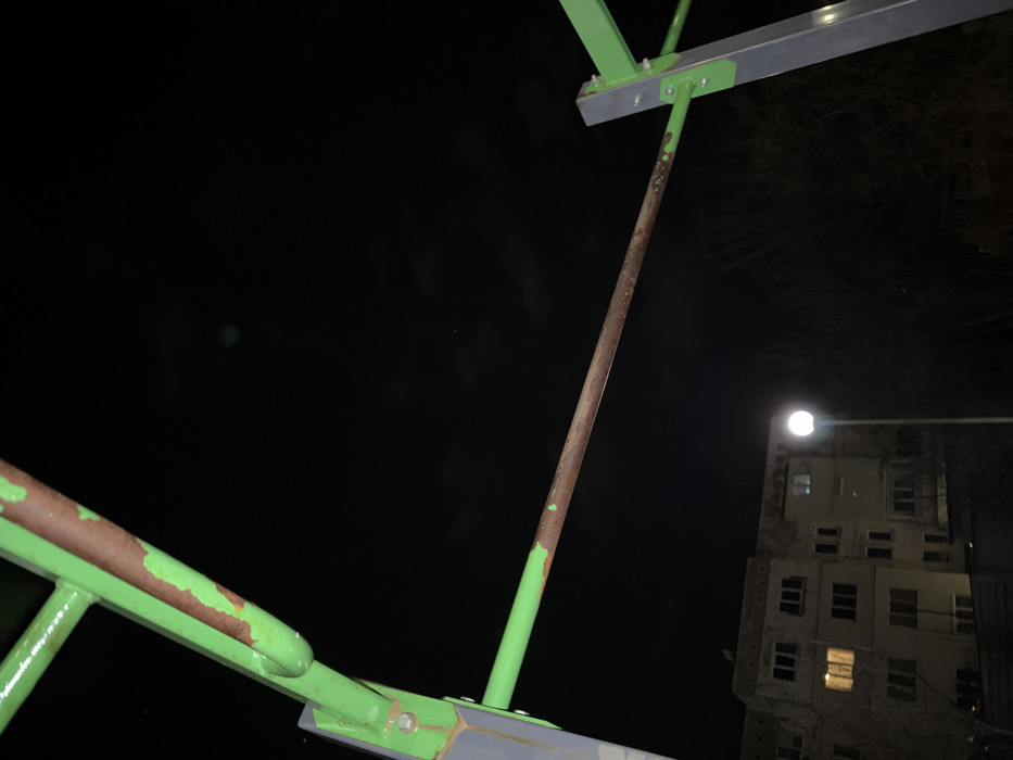 The scene depicts an outdoor urban environment at night in Kostinbrod, Bulgaria. In the foreground, a metal exercise structure, likely a pull-up bar, is partially visible, framing the lower portion of the dark night sky. The structure consists of gray and lime green painted metal supports and bars. The horizontal bar and some diagonal connecting elements exhibit significant wear, with large areas of lime green paint peeled away, revealing a rusty, brown metallic surface underneath. Bolts are visible securing the structural components. In the midground, a spherical streetlamp with a bright white light illuminates a section of the area. To the left of the streetlamp, a multi-story residential building with a light-colored facade is partially visible. Multiple windows are present on the building, with several displaying warm yellow interior lighting. To the right of the streetlamp, a dense cluster of dark, leafless trees or bushes is evident. The background consists of a dark night sky with faint cloud formations. No individuals are present in the image. A subtle green lens flare is observed in the upper central portion of the frame.