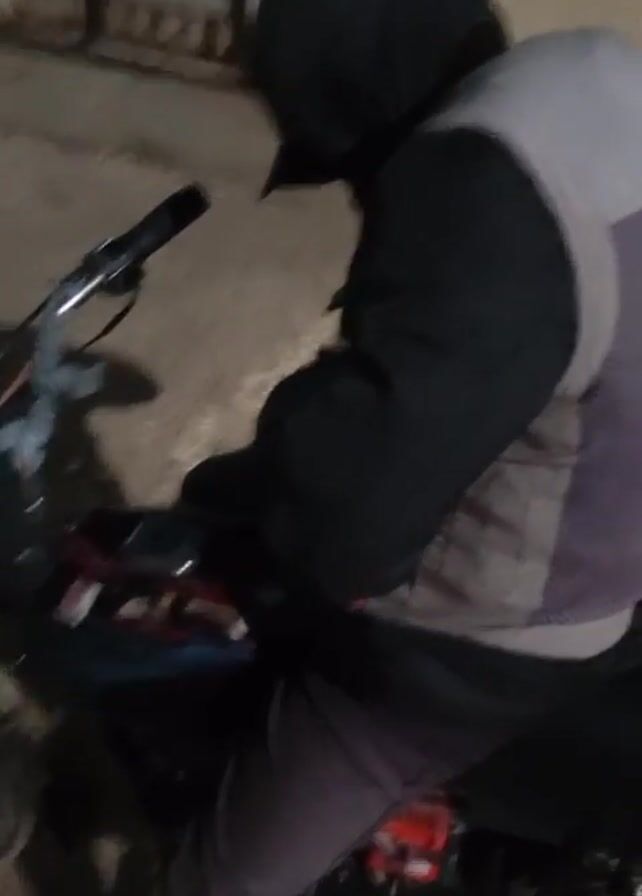 person sitting on a motorcycle, likely at night. The person is wearing a dark hooded jacket and a grey vest, along with dark pants. Their face is obscured by the hood and a cap. The motorcycle is parked on a paved surface, possibly a street or sidewalk. A metal gate is visible in the background. The motorcycle appears to be an older model with a dark blue or black color scheme and some stickers on the tank. The video is a close-up shot of the person and the motorcycle, with the surrounding environment slightly blurred.