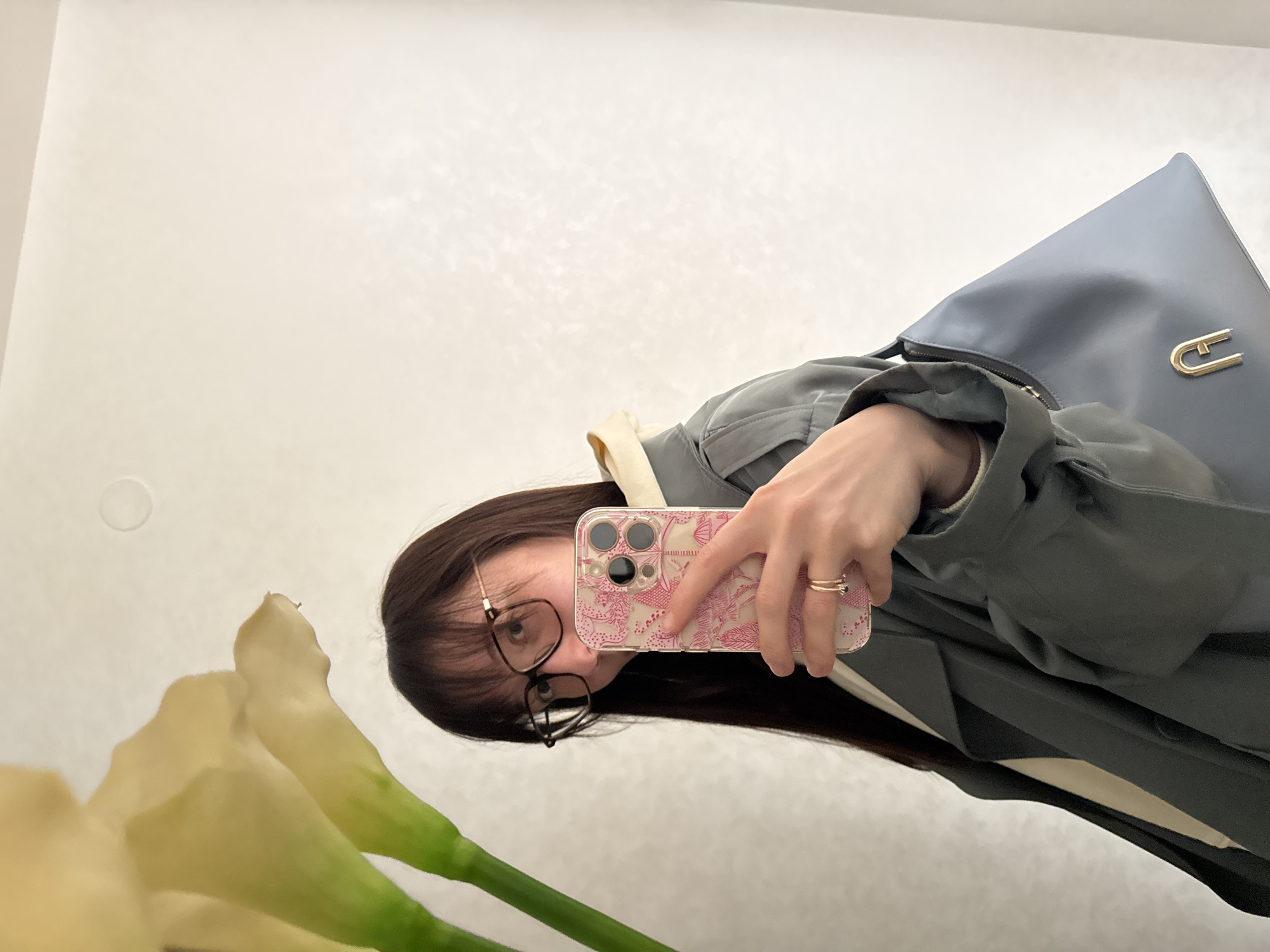 The image depicts a close-up indoor self-portrait of an individual, presumably female, with long, dark brown hair and bangs, wearing rectangular dark-framed glasses with gold-colored temple accents. The person is dressed in a dark grey or olive-grey trench coat over a light cream or beige inner layer, partially obscuring their body. Their right hand, adorned with a gold-colored double-banded ring on the ring finger, holds a smartphone vertically, positioned to cover the lower half of the face. The smartphone appears to be an iPhone 14 Pro or 15 Pro model, housed in a clear case featuring an intricate pink and white patterned design. The individual's visible eye (viewer's left) is directed towards the camera. On the right side of the frame, a light blue (periwinkle) handbag with a gold-colored, arch-shaped metal embellishment, possibly a "Furla Arch" logo, is visible, held by the person's left arm. To the left, two large, light yellow calla lilies with green stems are partially visible, extending from the bottom left corner upwards, obscuring a portion of the person's head and the background. The background consists of a plain, light-colored wall with a subtle textured finish. A faint circular indentation or fixture is present on the upper left portion of the wall. The location within the city of Novi Sad, Serbia, is not identifiable from the visual evidence present in the image.