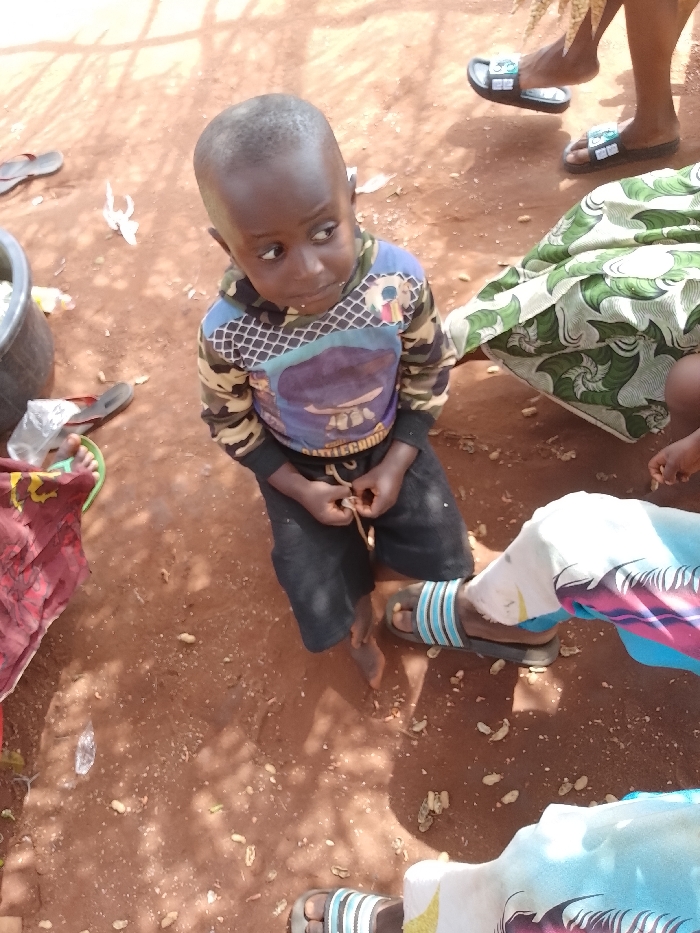 The scene depicts a daylight outdoor setting on reddish-brown dirt ground in Ejule, Nigeria. A young, dark-skinned child, appearing male, kneels in the center foreground, barefoot. He wears a long-sleeved camouflage-patterned shirt with blue graphic elements and dark-colored shorts. His hands are clasped in front of him, holding a small, light-colored object, possibly a peanut shell. His gaze is directed towards his right, slightly upwards, with a small amount of white residue visible on his lower lip. Surrounding the child are visible body parts of at least three other individuals. To the upper right, a person's bare lower legs and feet are visible, wearing black slides with white and green designs. A green and white patterned fabric is draped nearby. To the lower right, a leg clad in light-colored pants with a colorful pattern near the hem and a foot in blue and black striped slides are present. To the lower left, a foot in a lime-green slide and a piece of red patterned fabric are partially visible. The ground is uneven, scattered with numerous light-colored peanut shells. In the background on the left, a dark-colored bucket containing white material, a clear plastic bag, and a single dark slide are visible. The scene is brightly lit, with strong shadows indicating direct sunlight and dappled shadows from an overhead source across the ground.
