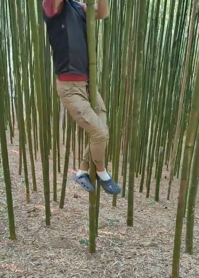 A man climbs a bamboo stalk in a bamboo forest. He is wearing a navy blue beanie, a black vest, a reddish pink t-shirt, khaki cargo pants, white socks, and navy blue Crocs. The man uses his hands to grip the bamboo, hoisting himself up. The forest is dense, with many bamboo stalks creating a wall around him. The ground is covered in dry leaves and wood chips.