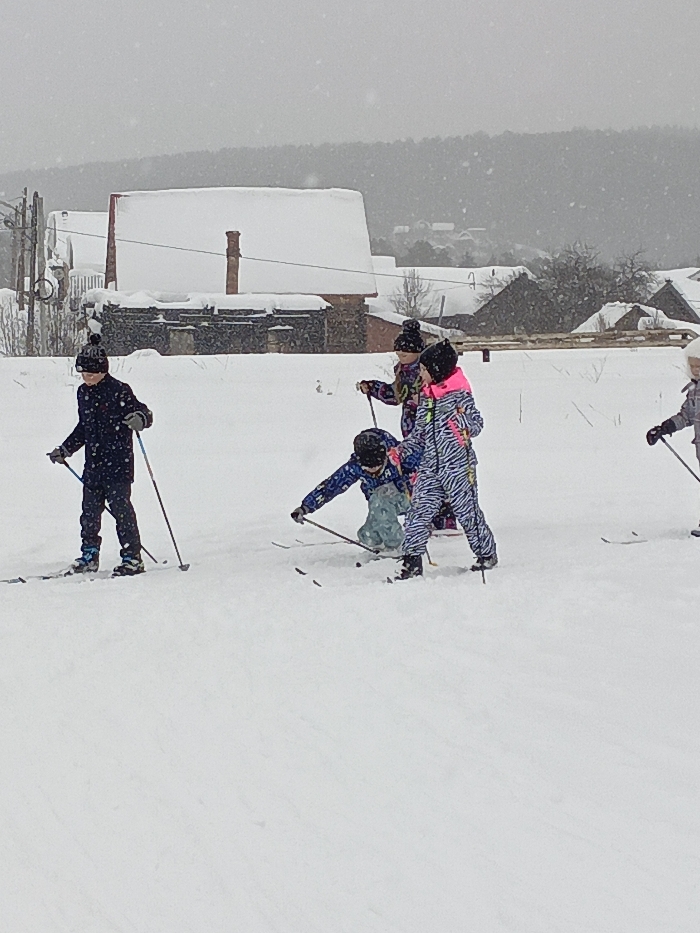 The image depicts an outdoor winter scene in Sarapul, Russia, characterized by active snowfall and an overcast sky. Five individuals, identified as children, are present in a vast, snow-covered field. From left to right in the foreground: 1. A child in a dark blue, possibly speckled, ski suit and a dark knit beanie stands upright on skis, holding a ski pole in each hand. 2. A child in a dark blue, possibly speckled, ski suit and a dark knit beanie is crouched low to the ground, appearing to be adjusting skis or having recently fallen. This child holds two ski poles and has skis visible on the snow. 3. A child in a distinctive black and white zebra-patterned ski suit with neon pink accents and a dark knit beanie stands upright on skis, holding a ski pole in each hand, facing towards the crouching child. 4. Partially obscured behind the zebra-suited child, a fourth child in a multi-colored ski suit and a dark knit beanie stands upright on skis, holding ski poles. 5. On the far right, a fifth child is partially visible from the chest down, standing on skis and holding a ski pole. This child wears a lighter-colored, possibly grey, ski suit. The midground displays several snow-covered buildings, including houses and what appears to be a barn or storage structure. One prominent building has a large, snow-covered gable roof with a single, tall brick chimney rising centrally. Utility poles with wires are visible on the far left. The background features distant, snow-covered hills with visible tree lines, indicating a rural or semi-rural environment. The entire ground surface is uniformly covered in undisturbed white snow.
