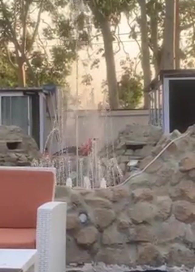 n outdoor scene. A fountain with multiple jets shooting water upwards is in the center, surrounded by rock structures. A peach-colored couch and a white wicker table are in the foreground. Tall trees are visible in the background, along with two small buildings. A person walks in front of the camera briefly, wearing a black vest and pants. The video is taken in daylight.