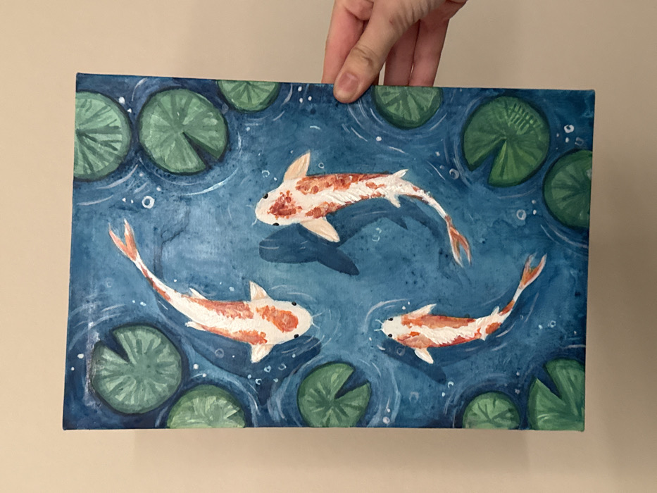- "A rectangular canvas painting, approximately 12x18 inches, depicting three koi fish and multiple lily pads in blue water, is presented against a plain, light beige wall" by FM-nsXlZ2, licensed under CC BY 4.0