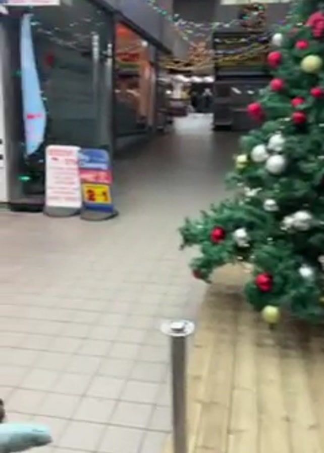 covered walkway in an urban environment. The walkway has a tile floor and overhead, festive Christmas lights. Two decorated Christmas trees stand on a short wooden platform. One tree is decorated with red, gold, and silver ornaments. The other tree is decorated with silver tinsel. The walkway is flanked by storefronts. A person wearing a long peach-colored garment can be seen walking away from the camera in the distance.