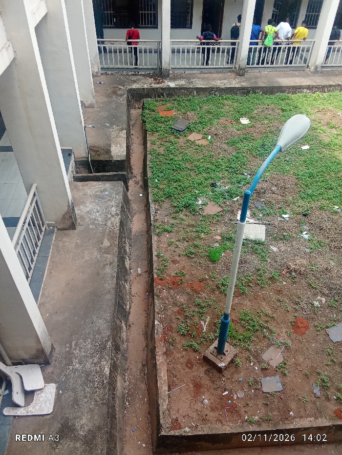 An elevated view captures a rectangular courtyard with a lamppost at the bottom-right. The courtyard is overgrown with grass and scattered debris. A building structure surrounds the courtyard, with people visible on a balcony in the background. A drainage trench runs between the building and the courtyard. The photo has a timestamp at the bottom-right.