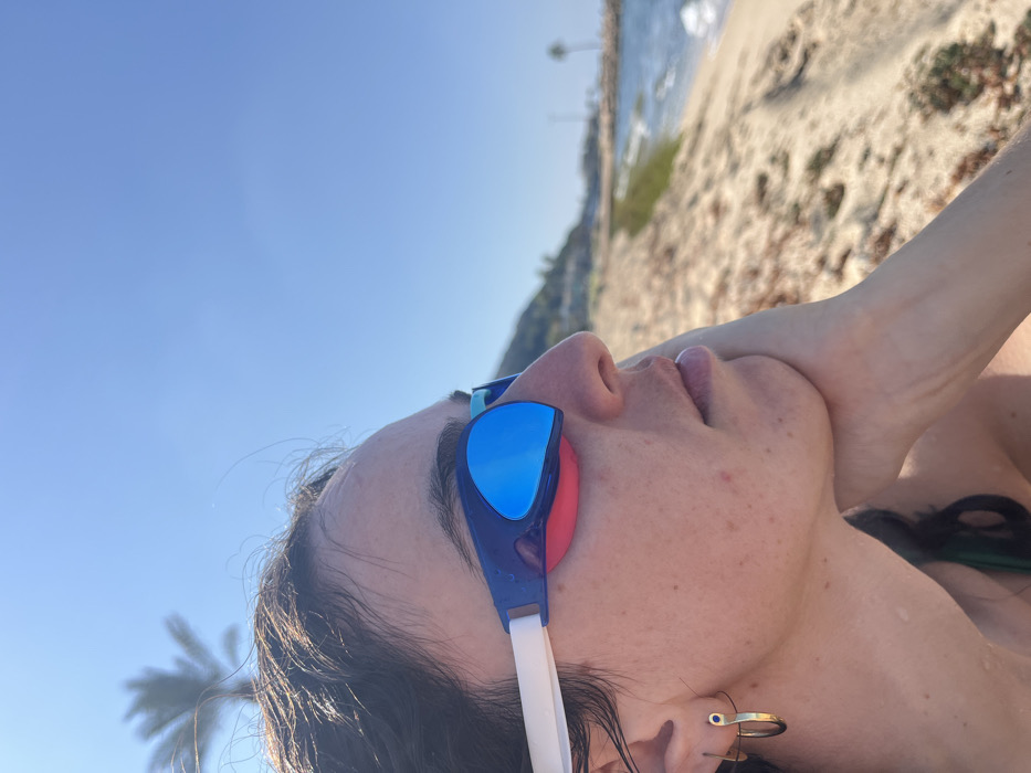 The image displays a close-up profile view of a young adult female on a beach under a clear, bright blue sky. The female is oriented with her left side towards the viewer, gazing off-camera to the right towards the ocean. She wears blue swimming goggles with mirrored lenses, a dark blue frame, red eye seals, and a white elastic head strap. Her dark hair appears damp, with individual strands visible against the sky. A gold-colored hoop earring with a small blue circular accent is present in her left earlobe. Her chin rests on her right hand. The background depicts a sandy beach stretching along a coastline, featuring scattered dry vegetation in the foreground and calm ocean waves breaking to the right. A breakwater or jetty extends into the sea in the mid-ground, beyond which distant hills with scattered white buildings and additional palm tree silhouettes are visible along the horizon. A prominent palm tree silhouette is also visible in the upper left corner. The scene is illuminated by strong, direct sunlight, indicating a clear day at a beach along the coast of Haifa, Israel.