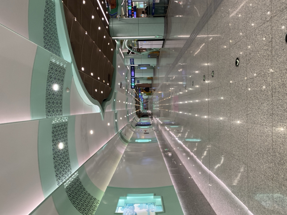 A long, brightly lit airport walkway stretches into the distance
