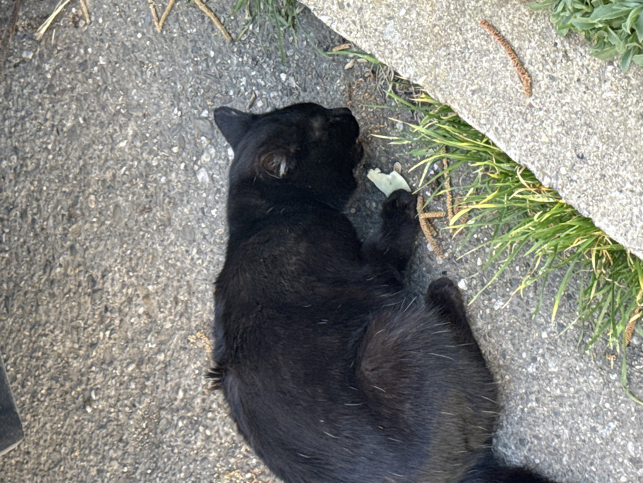 - "The image displays a black cat in a low, crouched posture on an asphalt surface, adjacent to a concrete curb" by FM-L8M0m1, licensed under CC BY 4.0