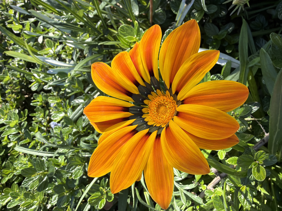 A vibrant, nearly symmetrical gazania flower blooms. Its petals are predominantly golden yellow, striped with orange. The center of the flower is a dark band of black, leading to a bright yellow, textured disk. The surrounding greenery includes various shades of green foliage, with a mix of textures and shapes. The scene is illuminated by natural sunlight.