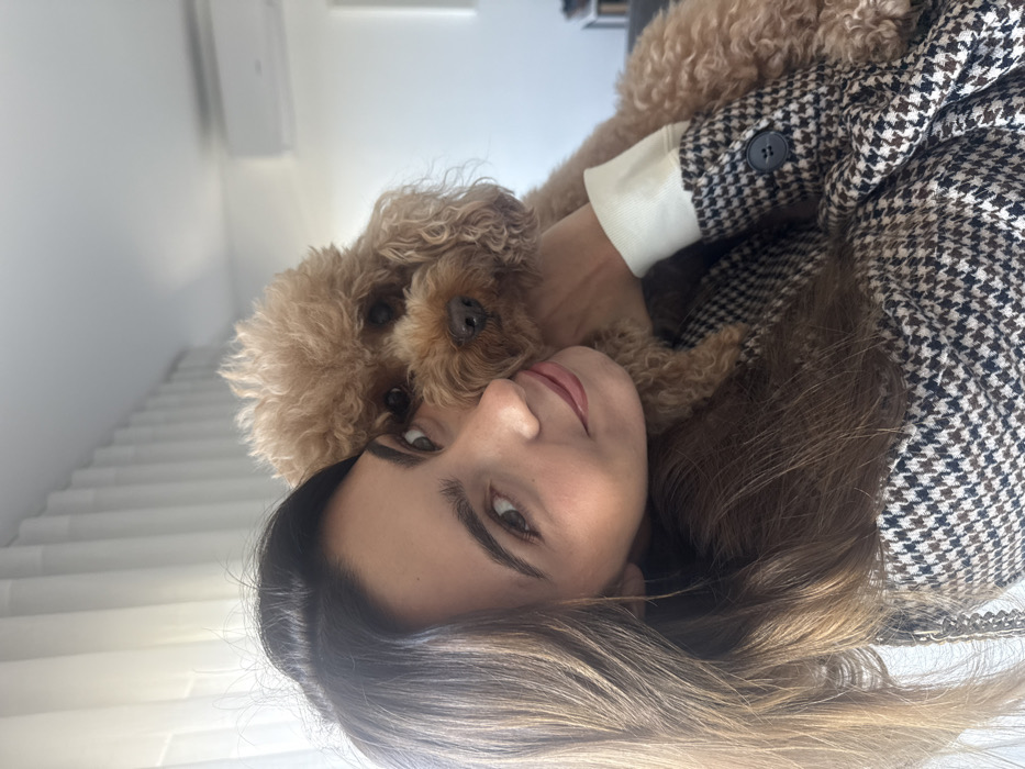 An indoor scene in Loures, Portugal, depicts a young adult female holding a small, light brown, curly-haired dog
