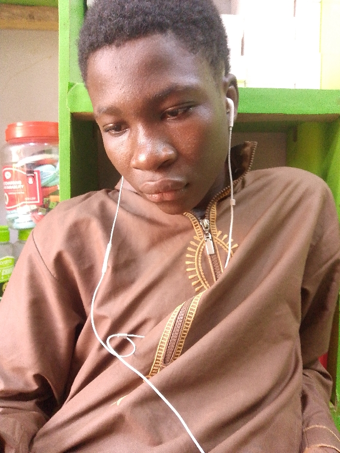 A young, dark-skinned person with short, dark hair is seen from the chest up. They are wearing a brown, long-sleeved shirt with decorative stitching around the collar and shoulder. White earphones are visible, with one in their ear. The person's gaze is cast downward. Behind them, there's a green shelf with a jar of candy and a bottle visible.