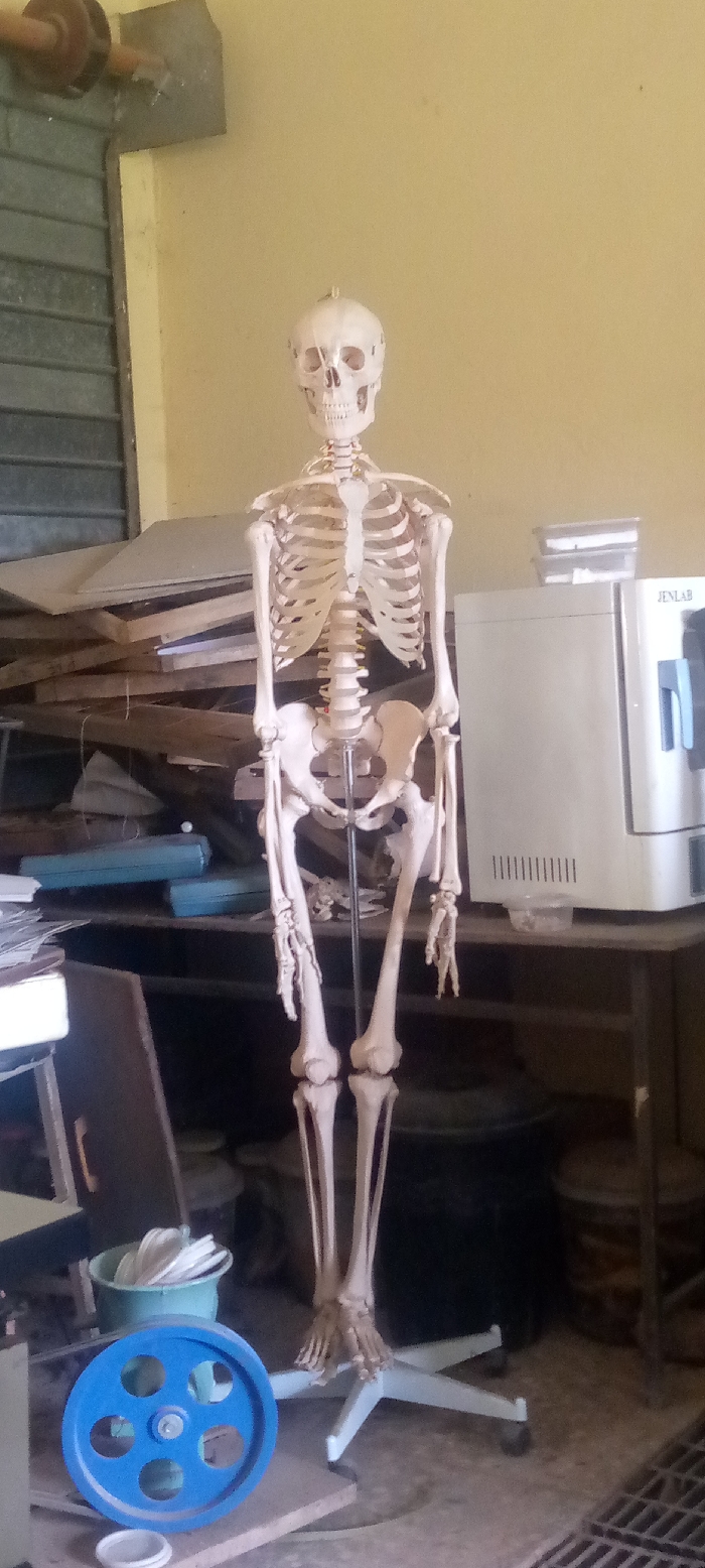 In the city of Unknown, Unknown, a life-sized anatomical skeleton model stands centrally in a cluttered indoor environment