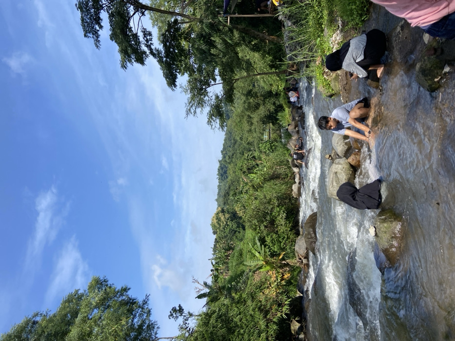 A stream flows diagonally through the frame, flanked by lush green vegetation on its left bank and rocky terrain on the right. Several people are near or in the water. One person in a hijab and another in a light-colored shirt are near the stream. Others can be seen further upstream. Trees line the upper edge of the greenery. The sky above is mostly clear, with scattered clouds.