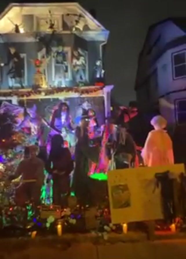 two-story house decorated with numerous Halloween decorations. On the second story's porch are figures dressed as monsters, including what appears to be Frankenstein's monster. The first story of the house is densely packed with Halloween-themed characters, including figures resembling witches and ghouls. Multi-colored lights and candles illuminate the scene. A poster-sized sign stands near the front of the yard. The video is shot at night.