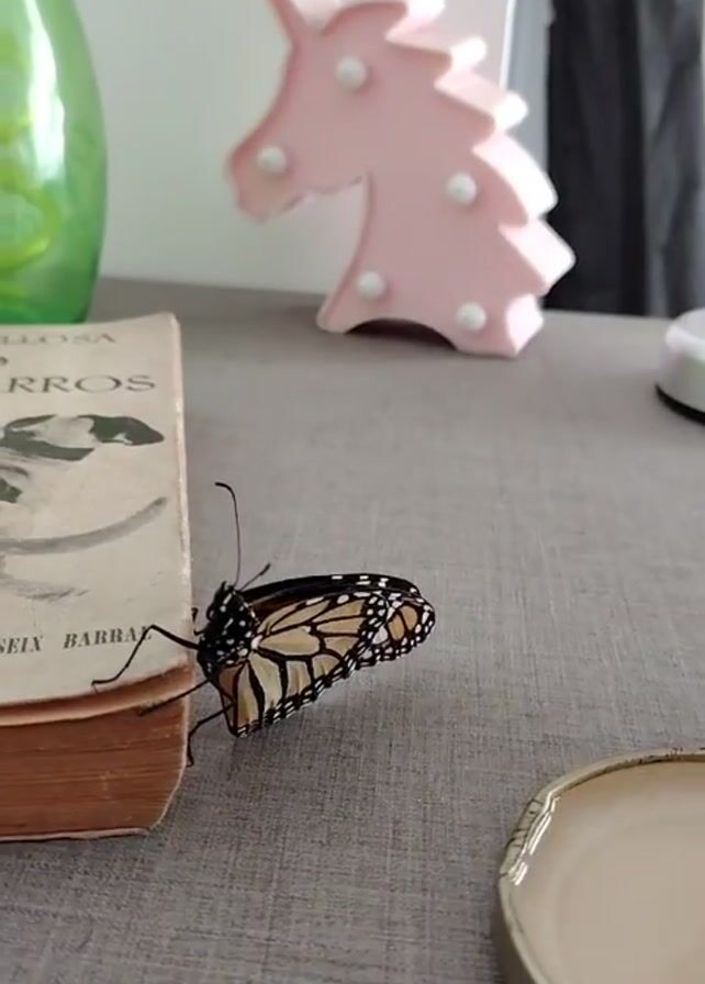 A stationary Monarch butterfly sits on a gray tabletop beside an old book, a jar lid, and a pink unicorn figurine